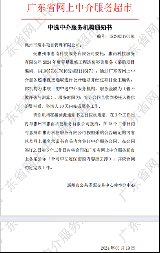 中選中介服務(wù)機(jī)構(gòu)通知書(惠南科技公司2024年度零星維修工程造價咨詢服務(wù))