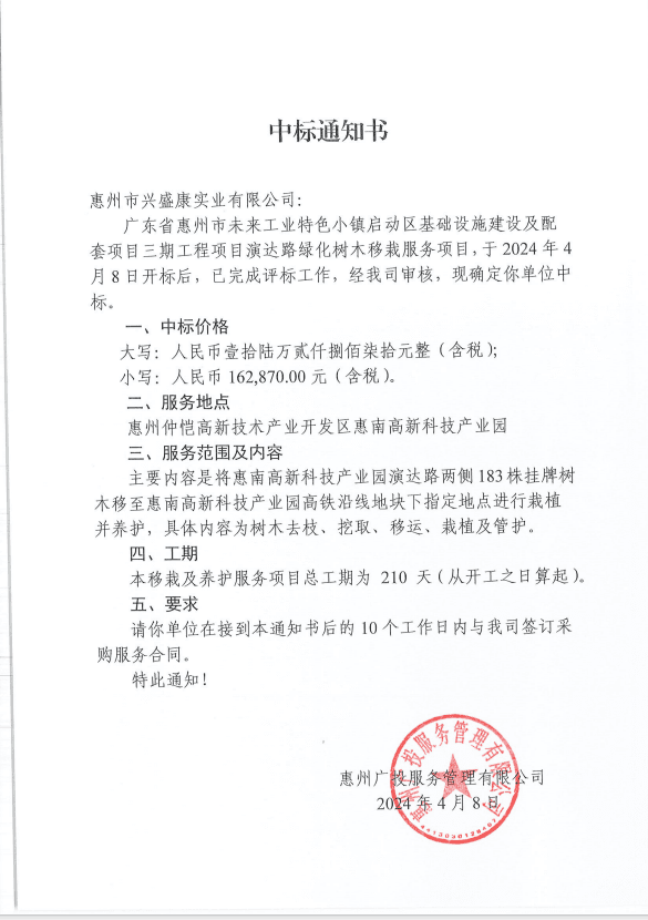 【中標(biāo)通知】廣東省惠州市未來工業(yè)特色小鎮(zhèn)啟動區(qū)基礎(chǔ)設(shè)施建設(shè)及配套項目三期工程項目演達(dá)路綠化樹木移栽服務(wù)