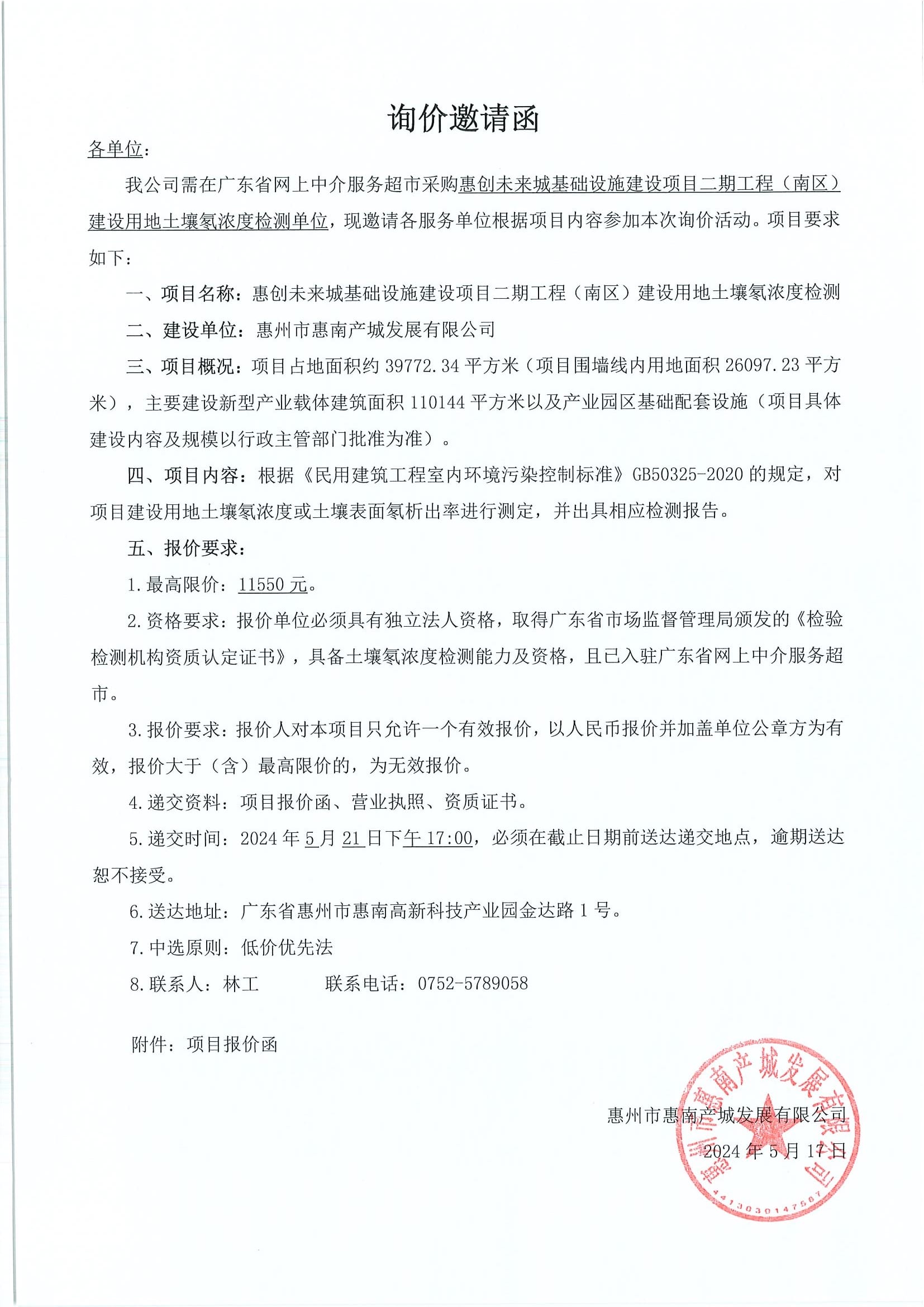惠創(chuàng)未來城基礎設施建設項目二期工程(南區(qū))建設用地土壤氡濃度檢測服務詢價邀請函