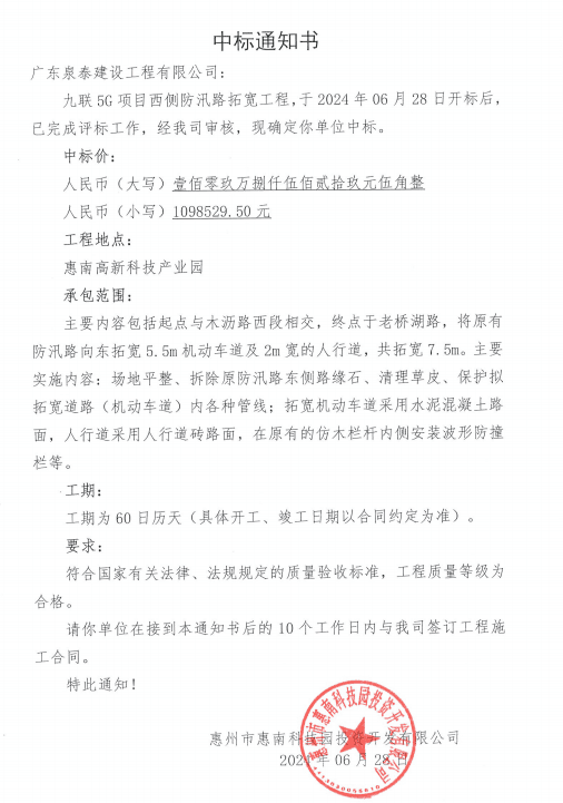 【中標(biāo)通知】九聯(lián)5G項(xiàng)目西側(cè)防汛路拓寬工程