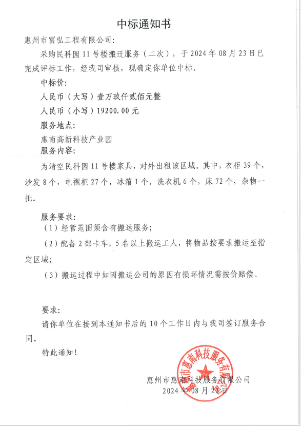 【中標通知】采購民科園11號樓搬運服務(二次)