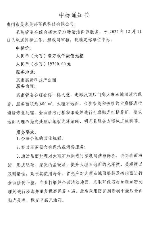 【中標(biāo)通知】采購管委會(huì)綜合樓大堂地磚清潔保養(yǎng)服務(wù)