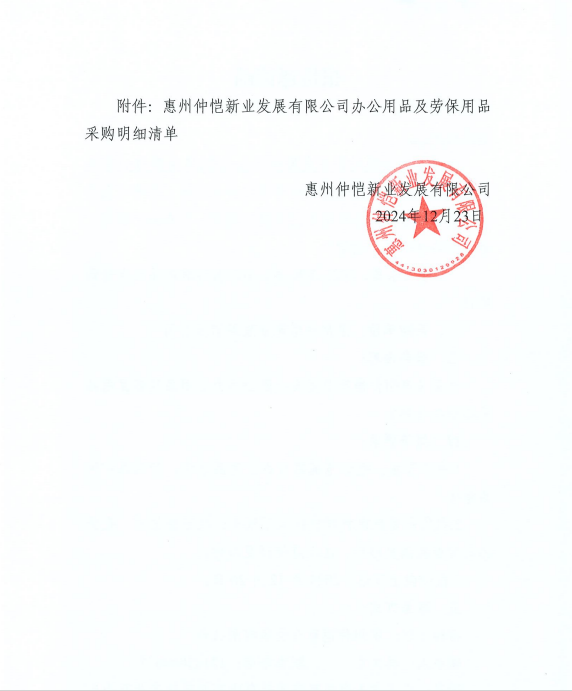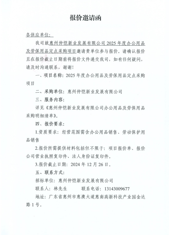 惠州仲愷新業(yè)發(fā)展有限公司2025年度辦公用品及勞保用品定點(diǎn)采購報(bào)價(jià)邀請函