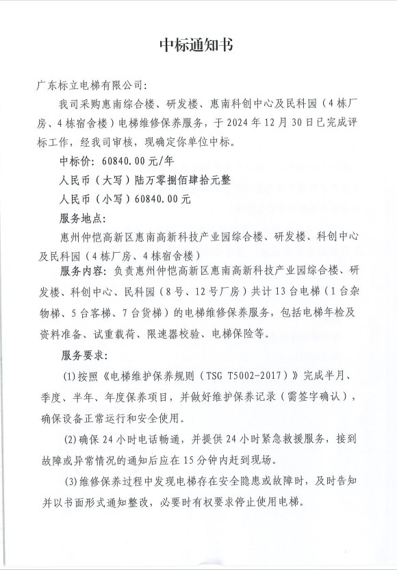 【中標(biāo)通知】采購惠南綜合樓、研發(fā)樓、惠南科創(chuàng)中心及民科園(4棟廠房、4棟宿舍樓)電梯維修保養(yǎng)服務(wù)