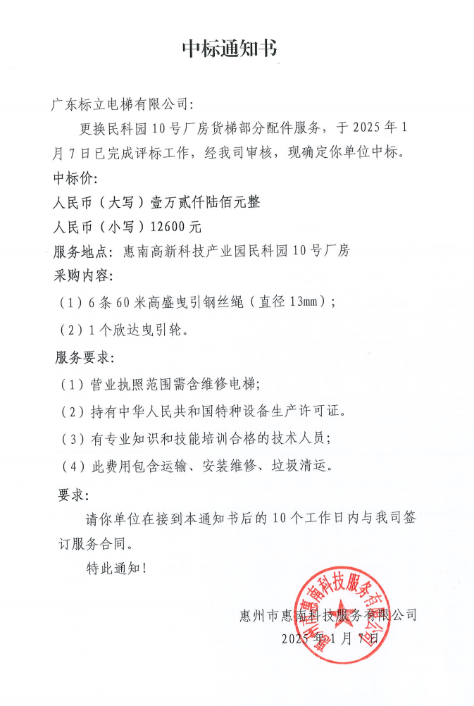 【中標通知】更換民科園10號廠房貨梯部分配件服務