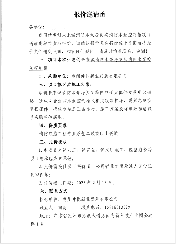 【報(bào)價(jià)邀請(qǐng)函】惠創(chuàng)未來(lái)城廠區(qū)水泵房柴油泵及配套設(shè)施維修項(xiàng)目