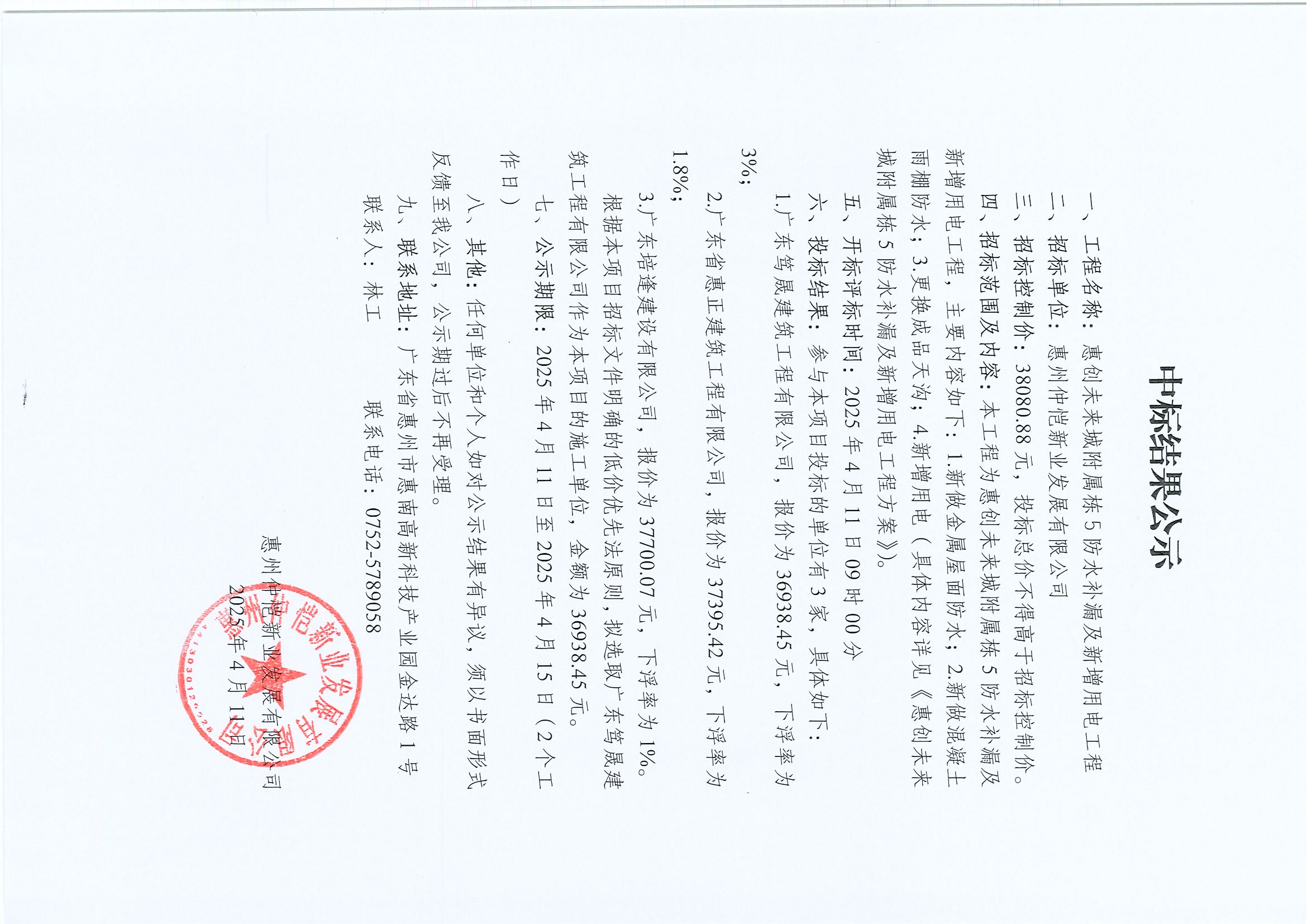 【中標(biāo)結(jié)果公示】惠創(chuàng)未來(lái)城附屬棟5防水補(bǔ)漏及新增用電工程