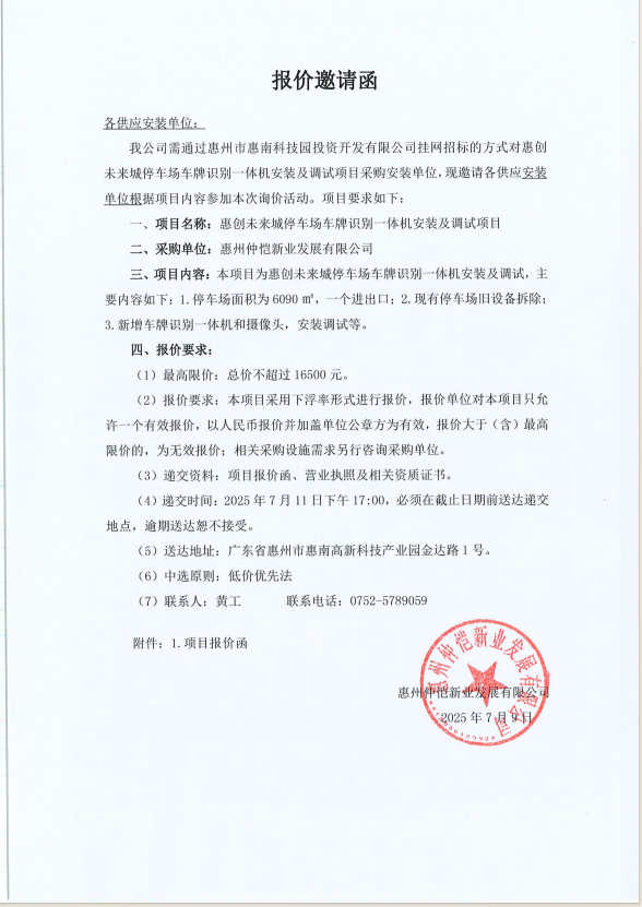 【報(bào)價(jià)邀請(qǐng)函】惠創(chuàng)未來(lái)城停車(chē)場(chǎng)車(chē)牌識(shí)別一體機(jī)安裝及調(diào)試項(xiàng)目采購(gòu)安裝單位