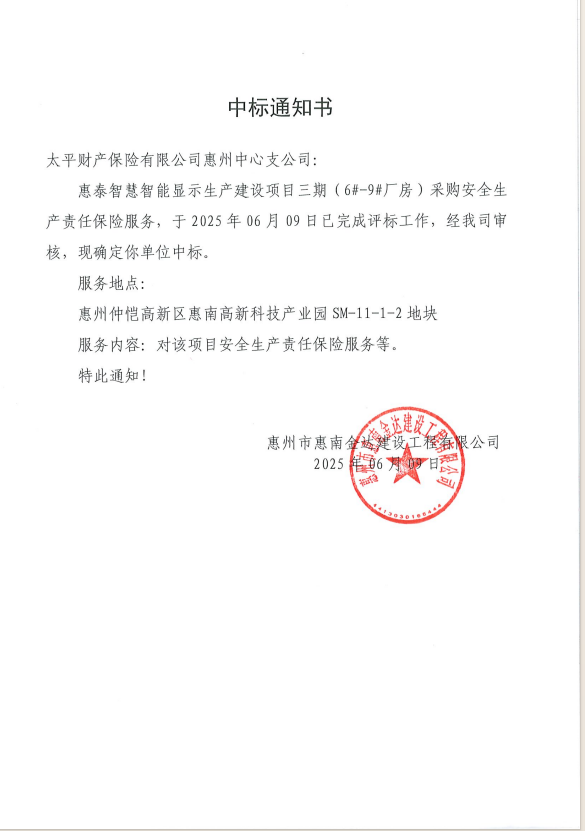 【中標通知】惠泰智慧智能顯示生產(chǎn)建設(shè)項目三期(6#-9#廠房)采購安全生產(chǎn)責任保險服務(wù)