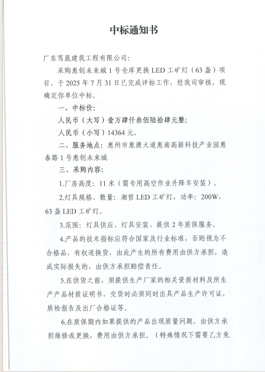 【中標(biāo)通知】采購(gòu)惠創(chuàng)未來(lái)城1號(hào)倉(cāng)庫(kù)更換LED工礦燈(63盞)項(xiàng)目