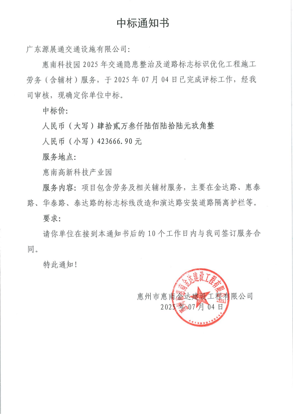 【中標通知】惠南科技園2025年交通隱患整治及道路標志標識優(yōu)化工程施工勞務(含輔材)服務