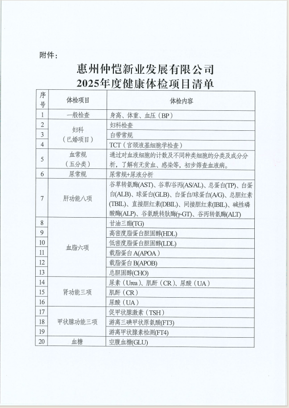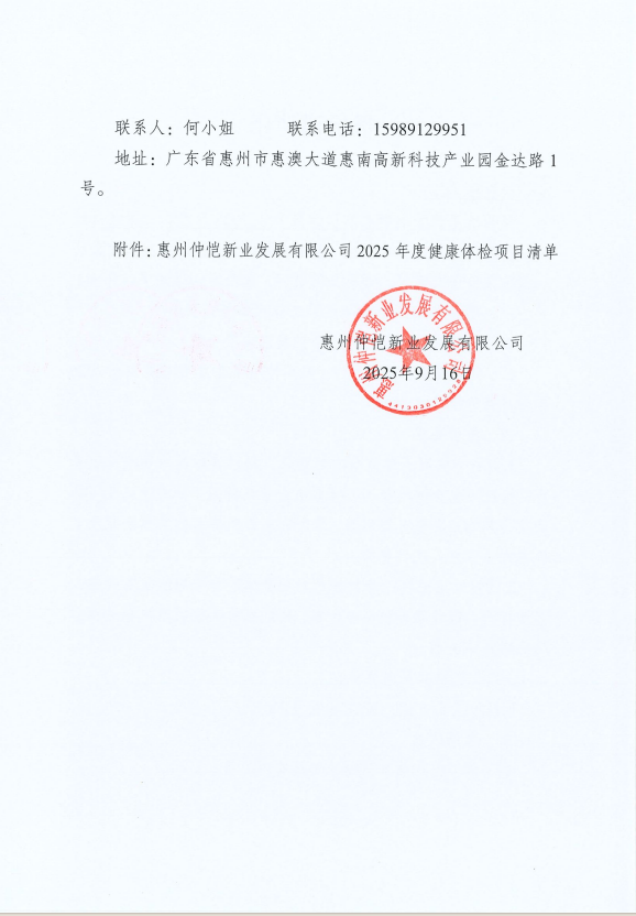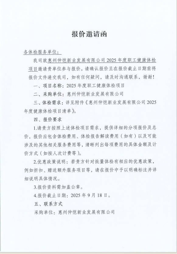 【報(bào)價(jià)邀請(qǐng)函】惠州仲愷新業(yè)發(fā)展有限公司2025年度職工健康體檢項(xiàng)目