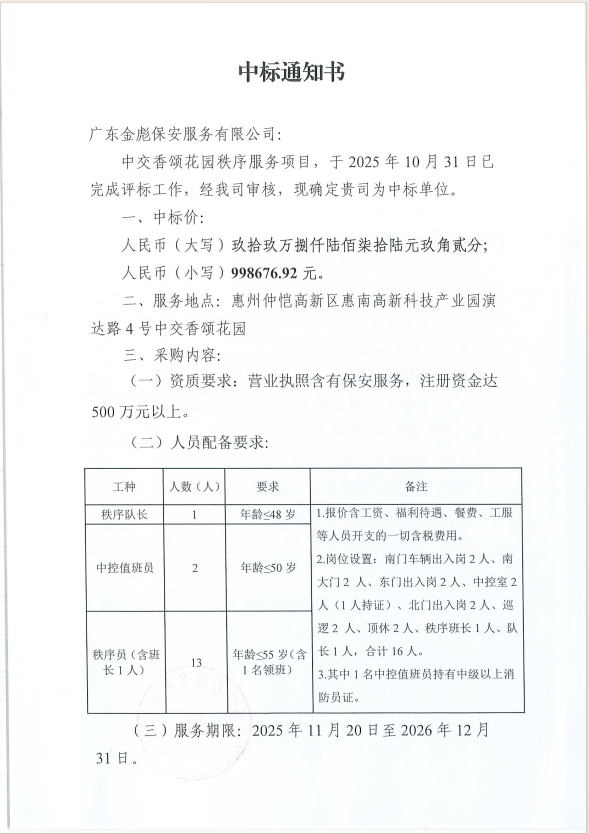 【中標(biāo)通知】中交香頌花園秩序服務(wù)項(xiàng)目