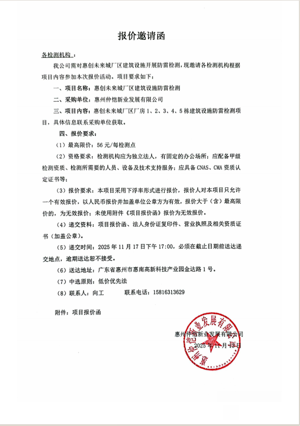 【報(bào)價(jià)邀請(qǐng)函】惠創(chuàng)未來(lái)城廠區(qū)廠房1、2、3、4、5棟建筑設(shè)施防雷檢測(cè)項(xiàng)目