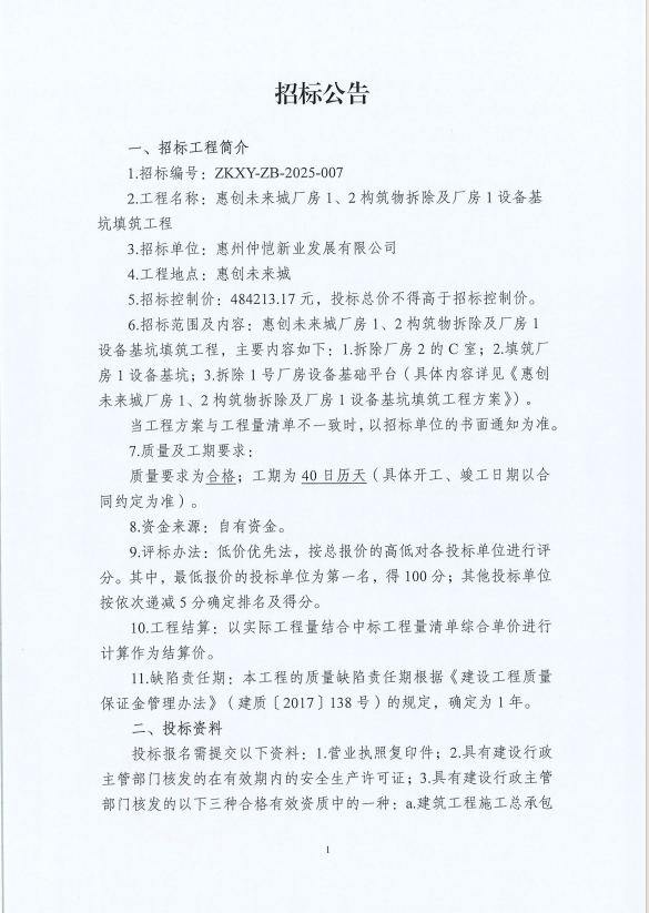 【招標公告】惠創(chuàng)未來城廠房1、2構筑物拆除及廠房1設備基坑填筑工程