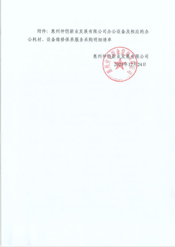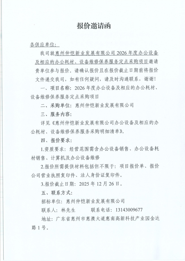 【報價邀請函】惠州仲愷新業(yè)發(fā)展有限公司2026年度辦公設備及相應的辦公耗材、設備維修保養(yǎng)服務定點采購項目