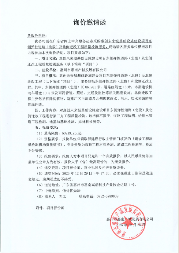 【詢價(jià)邀請(qǐng)函】惠創(chuàng)未來(lái)城基礎(chǔ)設(shè)施建設(shè)項(xiàng)目東側(cè)彈性道路(北段)及北側(cè)遷改工程質(zhì)量檢測(cè)服務(wù)