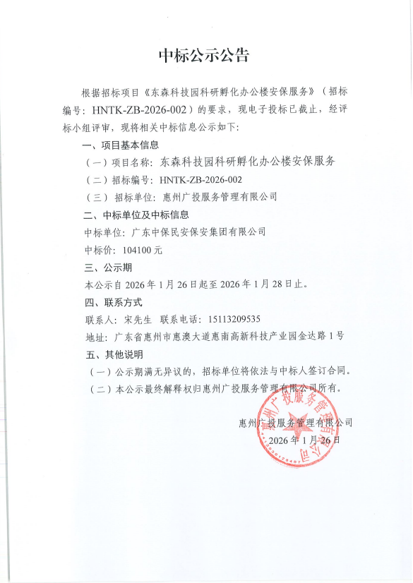 【中標(biāo)公示】東森科技園科研孵化辦公樓安保服務(wù)